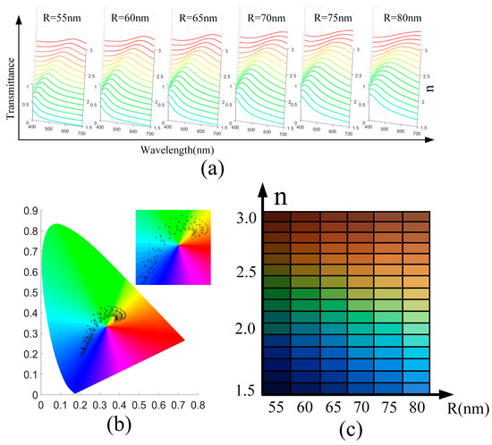 Considering the effect of effective refractive index changes on transmittance, we directly filled the holes with dielectric materials of different refractive indices. As shown in Figure 5a, we set the radius R of the circular hole to 55 nm–80 nm, and under each radius condition, we filled the hole with different dielectric materials with a refractive index of 1.5–3.0; the position of the transmission peak can cover the entire visible light band in the range of the refractive index 1.5–3.0. Similarly, we invert the simulation measured transmission spectrum to the CIE1931 chromaticity coordinate chart in Figure 5b in order to obtain the color coordinate points. Unlike the addition of nanoparticles, we can see from Figure 5a that the transmission peak has a smaller peak width, and the transmission peak has a larger Q value, so it has a better color contrast in the color display in the Figure 5c. In addition, the refractive index of the filled material is easier to control in practical application, so it has better realizability in the biosensor and color display. Moreover, by changing the effective refractive index of the medium to the color display, the device can be more intuitive and simple in sensing application.