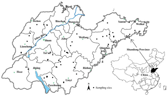 Shandong Province is situated in the eastern coast of China. Its total area is 155,800 square kilometers, and the total soil area is 121,100 square kilometers. It has a population of over 100.47 million and governs 16 cities (Figure 1). The topography of Shandong Province is complex and diverse; its eastern area belongs to the Shandong peninsula, the western and northern areas are parts of the North China Plain, and the southern area has various mountains [22]. The Yellow River, Haihe River, Huaihe River and many tributaries are the dominant rivers that flow through Shandong Province from the east to the west and finally discharge into coastal zones. In addition, brown soils, cinnamon soils and fluvo-aquic soils are three dominant soil types which account for 14.09%, 14.66% and 38.53% of the soil areas in Shandong Province, respectively [23,24]. The cultivated rate and agricultural added value in Shandong Province ranked first in China, among which, corn and wheat are the main crops. The gross value of the production of Shandong Province was 7647.0 billion in 2017, 43.99% of which was the added value of secondary industry. Therefore, Shandong Province is a big province for industry and agriculture, which provides an ideal research area to study the spatial distributions and contamination statuses of heavy metals in cropland soils of different cities, and the contributing factors. In addition, the metal accumulation in cropland soils from 2007 to 2017 can also be compared to analyze the metal changes during the decade [5].