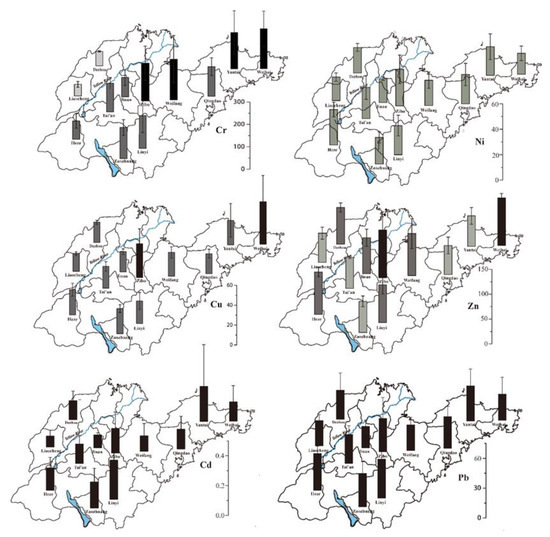 The spatial distribution patterns and concentrations of heavy metals in cropland soils of the cities in Shandong Province. Bars sharing the same color of each metal are not significant at α = 0.05 (Duncan test).