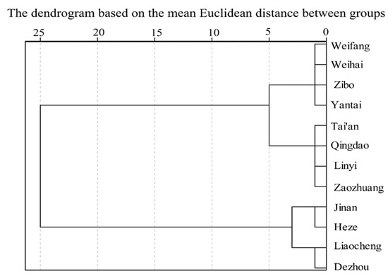 The average values of Cu, Pb, Cd, Cr, Ni and Zn were 24.13, 31.77, 0.16, 130.63, 22.13 and 71.19 mg·kg−1, respectively, suggesting that most cropland soils were suffering from the contamination of Cr, Pb and Cd. Concentrations of Cr ranged from 31.2 to 335.0 mg·kg−1; that indicated the significantly high spatial disparity in these cities. Contents of Cr in Liaocheng and Dezhou were below the background value, and significantly lower than that in other cities (Figure 2). Moreover, cluster analysis of Cr among the twelves cities showed that three coastal cities (Weifang, Weihai and Yantai) and one inland city (Zibo) were gathered into one cluster, with the significantly high concentrations of 181.13, 177.8, 161.62 and 172.78 mg·kg−1, respectively (Figure 2 and Figure 3). Similarly, the gross values of industrial output of Weifang, Yantai and Zibo were 230.75, 330.94 and 218.31 billon in 2017, which were also significantly higher than other cities, except Qingdao (tourism dominated the gross product). The higher accumulation of Cr and higher gross value of industrial output in these cities than in other cities may indicate that industrial producing can aggravate the accumulation of Cr in the agricultural soils, and the specific relations need further research. Both Albanese et al. [26] and Lei et al. [27] showed that certain metals can migrate from the inland to the coast, especially Cr and Ni, and in the areas along the flowing rivers. They showed that concentrations of Cr was gradually higher from inland to coast in this study, while the spatial distribution of Ni was not significant (Figure 2). This trend of Cr in this study may attribute to the impact of water flows and the high mobility of Cr [28].