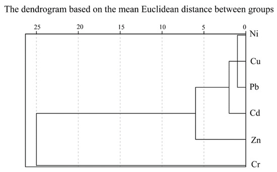 All the studied cities were polluted by Pb and Cd, except for Cd in Jinan and Liaocheng (Figure 2). Though the mean contents of Cd and Pb were 0.162 mg·kg−1 and 31.77 mg·kg−1, respectively, the concentrations of Cd in Yantai and Linyi reached 0.8 mg·kg−1 and 0.6 mg·kg−1, and the maximal Pb content was up to 73.9 mg·kg−1. The high standard deviation also suggested that point-source pollution commonly existed in these cities. Deposition of fly ash and irrigation can transfer exhaust gas and industrial waste to surrounding cropland soils directly, which would also lead to the high accumulation of heavy metals [33,34]. Thus, the point-source pollution and the similar spatial distributions of Cd and Pb may also attribute to the industrial activities [35,36]. Cluster analysis to the metals showed that Cu, Ni, Pb and Cd were gathered together, and then clustered the Zn, while Cr had no significant association with other metals, indicating that sources of Cr may be very complex (Figure 4). Shan et al. [37] reported that Cd, Pb and Zn in arable soils were mostly from the human factor, while Sun et al. [19] indicated the lithogenic origin of Cr. The significantly higher contents of Cr in certain cities in this study suggest multiple sources from human activities, not domination by natural sources.