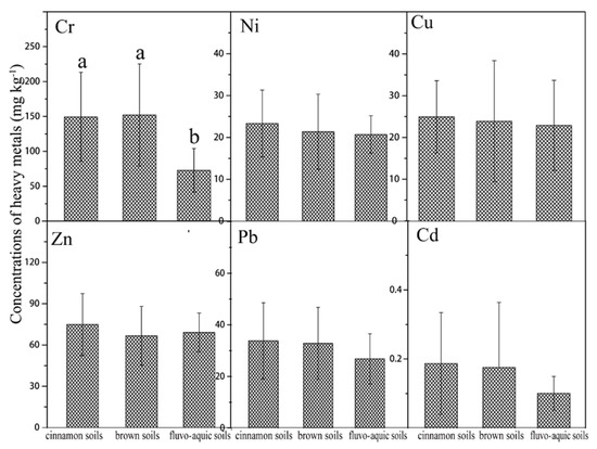 Based on the second national soil census in China, brown soils, cinnamon soils and fluvo-aquic soils are the main soil types in Shandong Province [8]. The sampling area in this study involved 26 sites of cinnamon soils, 14 sites of fluvo-aquic soils and 15 sites of brown soils. Previous studies showed that heavy metals had different accumulating features in different soil types, as the soils had different values of organic matter, pH, structural parameter, soil fertility, etc. [5,38,39]. In this study, concentrations of Cr in brown soils and cinnamon soils were 152.06 mg·kg−1 and 149.38 mg·kg−1, respectively, which were significantly higher than Cr in fluvo-aquic soils (72.86 mg·kg−1; Figure 5 and Table 2). Moreover, the distribution pattern of Cr was the opposite of the pH in the soil types, which was significantly higher in fluvo-aquic soils (8.16) than in brown and cinnamon soils (6.59 & 6.98). Cr is easily migratory and sensitive to pH; thus, the significantly contradictory pattern suggested that the low pH was prone to the migration and bio-accumulation of Cr in the cropland [40,41]. In addition, Yang et al. [39] also suggested that yearly cultivation acidized the farmland, which was more vulnerable to metal accumulation. Furthermore, the higher contents of Cr in brown and cinnamon soils may also be attributed to the different soil fertilities—a soil’s ability to supply and coordinate nutrients, moisture, air and heat for biological growth [42,43].