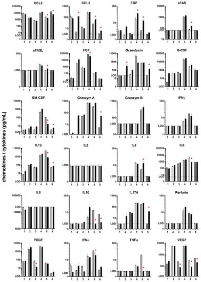Chemokine/cytokine secretory profile (in pg/mL) of 24 targets measured in culture medium from cutaneous melanoma punch biopsy cultures 24 h after exposure to cold physical plasma (dark bars) or left untreated (grey bars). LOD= lower limit of detection, except for IL8 (upper limit of detection); red asterisks demark significant difference (p < 0.05) between plasma and control samples for each patient (1–6); given are mean and the standard error of three technical replicates per patient and sample.