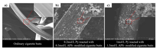 The surface morphologies of the Ppy cigarette filters were analyzed by Quanta 400 FEG SEM (FEI Company, Hillsboro, OR, USA). Functional groups on the cigarette filters’ surfaces were detected by FTIR VERTEX 80v (Bruker, Germany). The surface composition and elemental valence of Ppy particles on the cigarette filters’ surfaces were determined by XPS ESCALAB 250Xi (Thermo Fisher Scientific, Waltham, MA, USA). The water contact angle (WCA) and sliding angle (WSA) were measured using a JC2000 contact angle meter (Zhongchen, China). A 5 μL deionized water droplet was used to measure the water contact angle on the sample surface at room temperature.