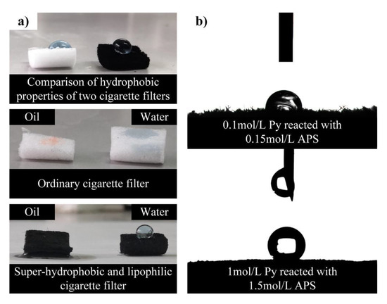 (a) Photographs of the wettability of an ordinary cigarette filter and a dodecanethiol-modified Ppy cigarette filter; (b) Contact angle images of dodecanethiol-modified Ppy cigarette filters with different Py concentrations.
