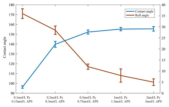 In order to further investigate the relationship between pyrrole content and surface wettability, the wettability of the modified filter was tested for different pyrrole contents, as shown in Figure 5. The contact angle increased with increasing pyrrole content, while the sliding angle decreased. When the pyrrole content was 0.5 mol/L, the contact angle was 150°, and the sliding angle was about 10°, fulfilling the requirements of superhydrophobicity. According to our SEM images, the pyrrole concentration can change the surface morphology of the filter. To our knowledge, the transition of the wettability of the cigarette filter from superhydrophilic to superhydrophobic can be realized by changes in the surface morphology and surface energy [39]. When the pyrrole content was lower, the filter surface was covered with unevenly distributed tiny Ppy nanoparticles. The water could wet the nanostructures but not spread on the filter surface owing to the hydrophobicity of dodecanethiol, which could be explained by the Wenzel mode [40]. With increasing pyrrole concentration, a large amount of Ppy particles aggregated and formed micro–nano hierarchical structures on the filter surface. With the help of low-surface-energy material, there was solid–liquid–vapor composite contact between the micro–nano hierarchical structures and water, which was consistent with the Cassie model [41]. Thus, a water droplet could easily roll off the modified cigarette filter surface owing to the existence of the air layer.