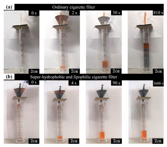 A simple gravity oil/water separation method was used to measure the oil separation efficiency. It consisted of a funnel and cigarette filters. Cigarette filters were pulled together with a steel string. These wired cigarette filters were squeezed into the neck of funnel. We poured the oil/water mixture into the funnel and waited for gradual separation. The oil/water separation efficiency (Qse) was calculated via Equation (1):