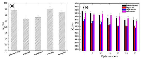 Plots of separation efficiency and stability: (a) Qse for different oils and organic solvents; (b) Qse for different cycle numbers.