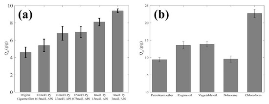 The absorption capacities of the as-prepared superhydrophobic cigarette filters: (a) Qab values for different Py concentrations; (b) Qab values of filters prepared using 2 mol/L Py for various oils and organic solvents.