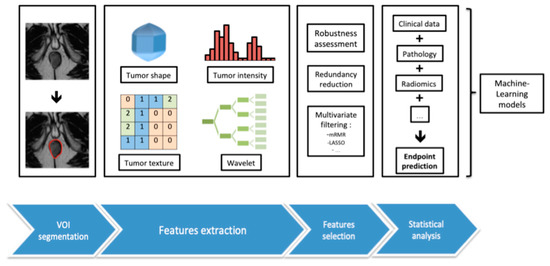 Several steps are conducted during the radiomic process, each bearing their own specifications, including image acquisition, data standardization, segmentation, features extraction and qualification, feature selection by stability and filtering, and finally, exploration of association with a selected clinical or paraclinical endpoint (Figure 1). These techniques already display promising results in the field of oncology, for a wide range of diseases [15,16]. Nevertheless, several limitations prevent radiomic tools to be extensively used in clinical routine, mostly due to the lack of technical standardization and need of validation on independent cohorts.