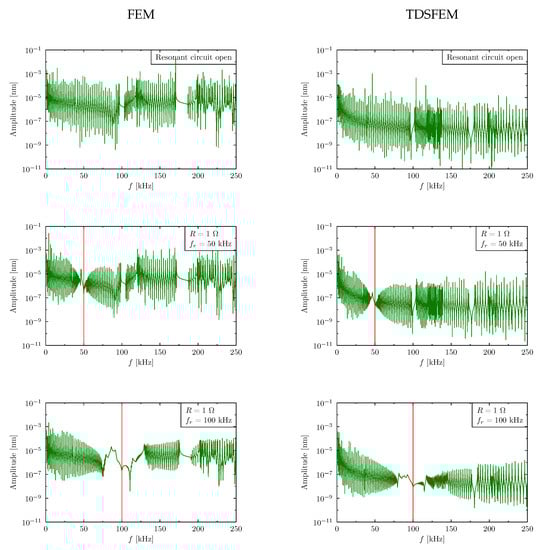 Numerical modelling of the piezoelectric material properties was based on the approach proposed in the literature [,]. The authors presented there a formulae for calculation of the effective Young’s modulus of the piezoelectric element being an element of a resonant circuit. The piezoelectric material has frequency-dependent stiffness and damping, and the frequency itself depends on the parameters of the resonance circuit. Therefore, the effective Young’s modulus of the piezoelectric material in the resonant circuit can be described by the equation: