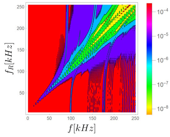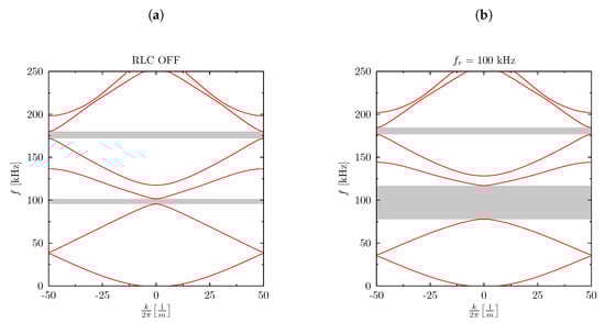 Next Figure 8 shows the dispersion curves determined for the analysed periodical beam in the first Brillouin zone [,]. These curves have been determined by the use of the Bloch reduction method [] by taking into account the relation from Equation (1). The graph in Figure 8a shows the first Brillouin zone of the passive system. One can notice the red lines meaning the vibrations of the propagating wave. The frequency ranges, marked with grey areas, at which there is no wave propagation are visible, i.e., there are no corresponding wave vectors. On the second chart in Figure 8b there is the first Brillouin zone of the system with each RLC circuit tuned to 100 kHz (frequency from the range of the band gap). RLC circuits create an area of anti-resonant vibrations independent of the wave vector that effectively widens the area of the grey fields of blocked wave propagation.