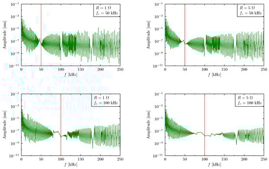 Frequency response functions of an active periodic structure with the resonant frequency of 50 kHz or 100 kHz (red line), and the resistance of 1 Ω (left) or 5 Ω (right).
