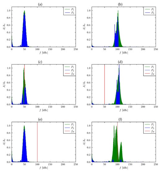 To illustrate the damping character of an active periodic beam with the piezoelectric RLC circuits the following set of results was gathered (Figure 10). Here the vibration spectra before and after passing through the structure have been shown. The green colours show the spectra of vibration measured before passing through the structure (), the blue after passing through the structure (). The red line represents the tuned resonant frequency () of the RLC circuit. The left hand side column represents the data calculated for 50 kHz excitation signal, the right hand side column for 100 kHz respectively.