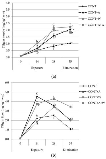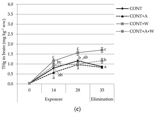 In general, the liver exhibited higher Hg concentrations (ranging from 2.52 to 4.29 mg∙kg−1 ww), followed by brain (ranging from 0.97 to 1.57 mg∙kg−1 ww) and muscle (ranging from 0.83 to 2.14 mg∙kg−1 ww), regardless of treatment (Figure 1).