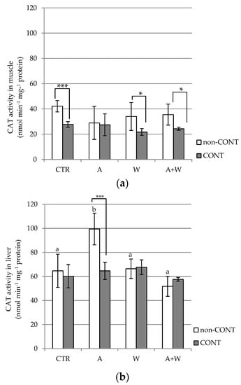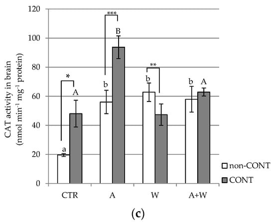 Catalase (CAT) activity (nmol∙min−1∙mg−1 protein, mean ± SD) in S. senegalensis muscle (a), liver (b), and brain (c) after 28 days of Hg exposure. White bars represent non-contaminated treatments (non-CONT) and gray bars represent Hg-contaminated treatments (CONT). Control (CTR)—seawater temperature set at 19 °C and pH set at 8.0 units; A—seawater temperature set at 19 °C and pH set at 7.6 units; W—seawater temperature set at 23 °C and pH set at 8.0 units; A + W—seawater temperature set at 23 °C and pH set at 7.6 units. Different small letters denote significant differences between non-CONT treatments (ANOVA, p < 0.05). Different capital letters denote significant differences between CONT treatments (ANOVA, p < 0.05). Asterisks (*) represent differences between non-CONT and CONT for the same conditions (Student’s t-test: * p < 0.05; ** p < 0.005; *** p < 0.0005).