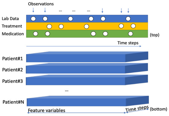 Irregularly collected events observations (top) 3D format input for serial data model (bottom).
