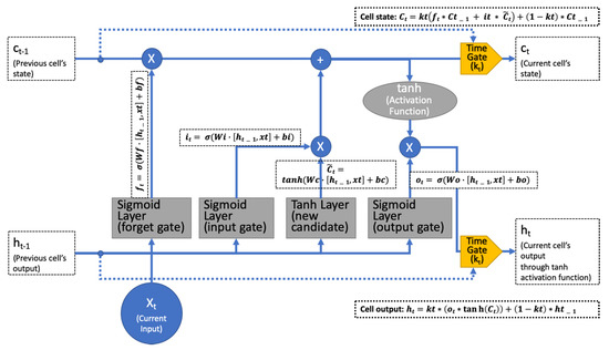 Phased-LSTM selectively updates the status to account for irregular sampling times through an additional time gate [14]. At each time step, the time gate switches on and off to update the state and the hidden output state. These updates only happen for the open phase. Otherwise, the previous values will be used. The time gate addresses the LSTM problems caused by irregularly sampled data (see Figure 3).