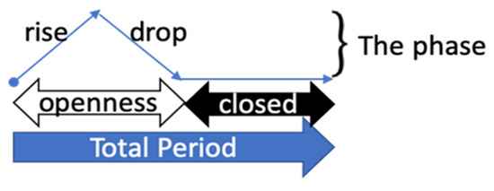 In this case, ϕt is an auxiliary variable that represents the phase of the cycle (Equation (1)), t is the time point, s is the phase shift, τ is the period that controls the real-time period, and ron is the ratio of the open period to the total period τ [14].