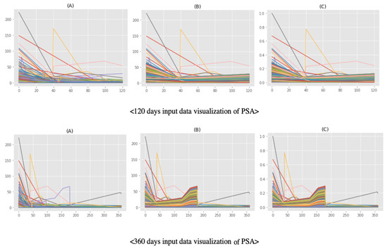 Figure 5 shows the prior data shape, oversampling result, and scaling result for 120 and 360 days of serial data. We used SMOTE to generate CRPC-treated data similar to the prior CRPC cases. Lastly, we obtained balanced data (1575:1576, CRPC: non-CRPC treated) compared to the prior data that was highly imbalanced (8:1584, CRPC: non-CRPC treated).