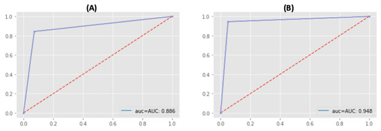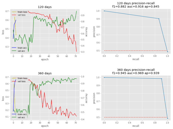 Both sets used four epochs (blue lines), which is the number of training iterations. To prevent building the overfitted model, we manually determined four epochs by testing 10 epochs (see Table 2). Although the training time was short, the 120-day set has a recall precision of 91.6% and the 360-day set had a recall precision of 96.9%. The validation loss (red lines) of the 120-day set converged slowly, while that of the 360-day set converged quickly (see Figure 6). Ultimately, the Receiver Operating Characteristic/Area Under the Curve (ROCAUC) accuracy result of the 120-day model is 88.6% and the 360-day model is 94.8% (see Figure 7).