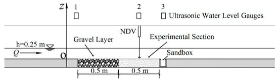 The velocities are collected by a high-resolution acoustic velocimeter—Nortek Acoustic Doppler Velocimeters (NDV) (Range: ±0.01–±4 m/s, Accuracy: ±0.5% of measured value ±1 mm/s,), which was placed in the middle of the experimental section at 2 mm high from the bed to measure the instantaneous point velocity of the near-bottom flow. Data collection frequency was set to 100 Hz. water level gauge probes (denoted as “1”,“2”, and “3”) were placed in front of the gravel layer above the test section and above the sandbox respectively. These are for the measurement of the water surface changes during the process and the surface elevations were sampled at 20 Hz.