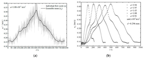 Unsteady flow rate curve under d = 0.296 mm (a is the velocity skewness, d is the particle diameter). (a) Ensemble mean of the flow velocity and (b) Variation of flow velocity in different (continuous lines).