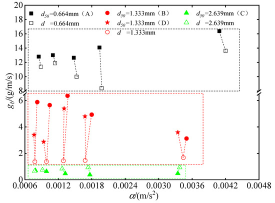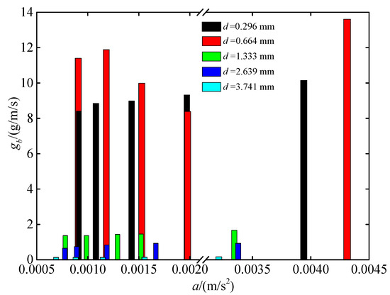 Figure 4 shows the variations of all the uniform sand transport rates gb with different velocity skewness a under unsteady flow conditions. It can be seen that for the same particle size, the sediment transport rate increased with the increase of velocity skewness except for the case of d = 0.664 mm. It was initially increased to 11.89 g/m/s, but then decreased after a = 1.18 × 10−3 m/s2 and ultimately followed by a surge to 13.61 g/m/s when a = 4.31 × 10−3 m/s2. Based on the experimental video, it was found that the bed surface changes and sand waves appeared at the velocity skewness a = 1.98 × 10−3 m/s2 (Δt = 20 s), and a = 1.53 × 10−3 m/s2 (Δt = 30 s). With the sand waves slowly moving forward in the limited time, the subsequent transport process was hindered. Thus, the sediment particles were not effectively transported into the sand collecting box under unsteady flow. The amount of sediment collected in these two cases was small, which caused a lower sediment transport rate. When the velocity skewness continued to go up (Δt = 10 s), the bed sand wave was fully developed and transferred to the sand collecting box throughout the flow cycle. In general, the sediment transport rate increased with the rise of the velocity skewness under uniform sand conditions.