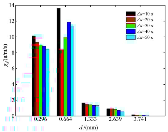 Figure 5 depicts the change of sediment transport rate of five uniform sands under five unsteady flow conditions. It can be seen that with the increase of sediment particle size d, the sediment transport rate gb firstly increased but then decreased. Around the particle size d = 0.664 mm, the sand rate basically reached a maximum under different velocity skewness, except the red bars (Δt = 20 s). It keeps declining from 9.32 to 0.14 g/m/s when Δt = 20 s.