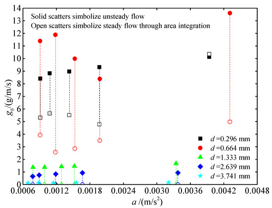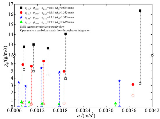 It can be seen from Equation (25) that when the flow is steady, the flow acceleration is zero and the velocity skewness is equal to zero, results in becomes zero. The flow velocity of the critical start of the sediment particles is , then , namely the incipient velocity of the sediment particles under the unsteady flow during the acceleration process was smaller than the incipient velocity of the sediment particles under the steady flow. Therefore, the sediment particles under unsteady flow conditions were easier to start transport. As shown in Figure 7, to achieve the same sediment transport rate, the flow velocity of the steady flow was obviously larger than the steady flow velocity through integration of unsteady flow. Therefore, the sediment particles under the unsteady flow were more likely to start and move.