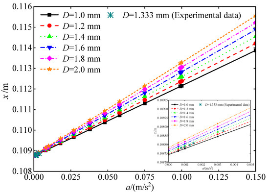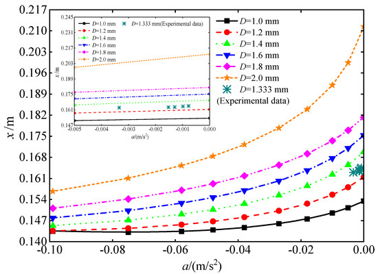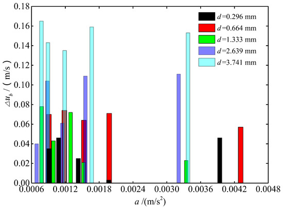 The influence of the flow velocity skewness on travel distance of the particle under deceleration was also analyzed. The initial conditions that a = 0~0.28 m/s2, CD = 0.4, CL = 0.1, ρ = 1000 kg/m3, ρs = 2650 kg/m3, t = 0.3 s, D = 2R = 1~2 mm Δ = 0.5 mm, ub = 0.5 m/s, and u0 = 0.2 m/s are given to deal with the travel distance Equation (33), deriving the relationship between the travel distance and the velocity skewness in the deceleration phase, as is shown in Figure 15. In this figure, theoretical results are compared with experimental data in the study, which can be found that the theoretical results are agreed with experimental data well.