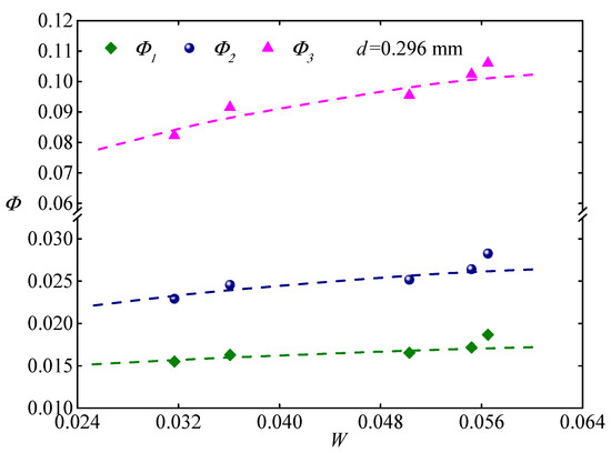 Taking the size distribution of uniform sand bed with d = 0.296mm as an example, the relationship between the unsteady parameter W and the sediment transport intensity Φ1, Φ2, and Φ3 was plotted. Figure 8 depicts the intrinsic law of the influence of unsteady parameters on sediment transport intensity. It was indicated that the sediment transport intensity increased with the increase of unsteady parameters (dashed line). The unsteady parameter had an exponential relationship with the sediment transport intensity. The growth rate of sediment transport intensity declined with the increase of unsteady parameters. Therefore, the relationship between the sediment transport intensity and the unsteady parameter was not simply linear, it follows Φ ~ (aW2 + bW + c), where a, b, and c were constant.
