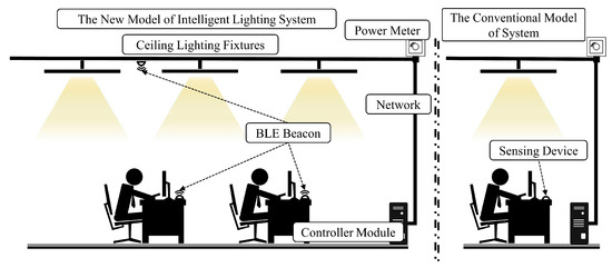 The intelligent lighting system consists of the basic components of a ceiling lighting fixture, in addition to the controller unit, and an illuminance sensing device. We have replaced the illuminance sensing device with another technological system rather than the manual control in the system. In this section, we describe the conventional model of the intelligent lighting system, and the new model of the system, as shown in Figure 1.