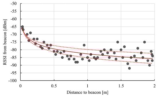 Therefore, the RSSI range is the smallest and largest transmission signal in dBm, in which the accuracy is the average error for each transmission signal. The indicator linearity deviates the computed function of energy. RSSI is changed by the distance between the beacon and the smartphone, as in Figure 2. RSSI is measured to know the changes in the distance between the beacon and the smartphone.