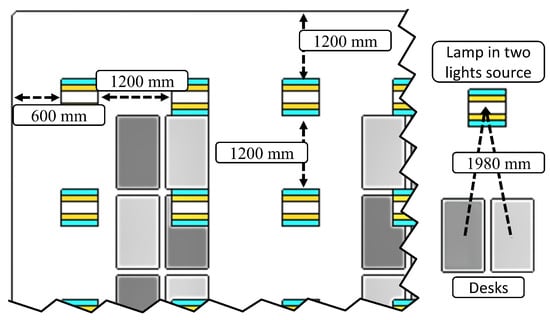In this experiment, we have 42 positions for the workers, as shown in Figure 3. Each desk has a random target of 300 lx, 500 lx, and 700 lx for the preferred illuminance. We distribute the illuminance based on the preferred individual illuminance for each user in the office.