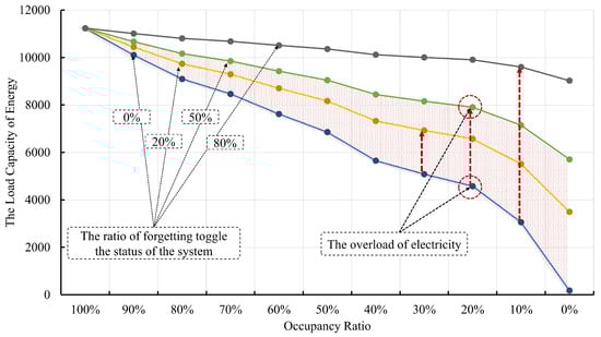The load capacity of energy for the occupancy status compared with forgetting to toggle the status of the intelligent lighting system.