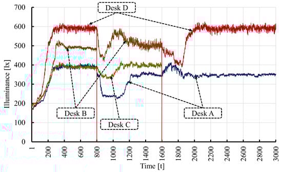 In the next experiments, we have four workers to validate the intelligent lighting system in realizing the target for each worker. The illuminance targets 350 lx, 500 lx, 400 lx, and 600 lx are distributed for each worker, respectively. Each worker changes the illuminance target using the smartphone, and the smartphone is close to the beacon on the desk. Based on RSSI, the smartphone received the signal from the close beacon. Then the system detects the beacon and the intelligent lighting system realizes the target for each worker. The target was realized as 378.76 lx, 494.24 lx, 383.41 lx, and 581.45 lx for each worker, respectively, as depicted in Figure 6.