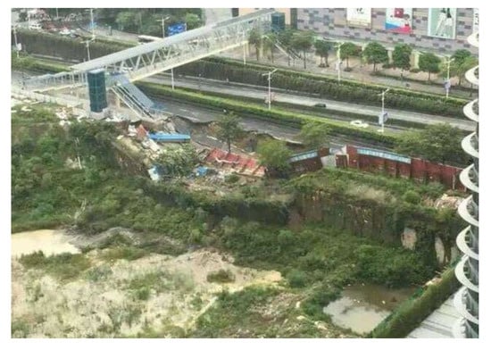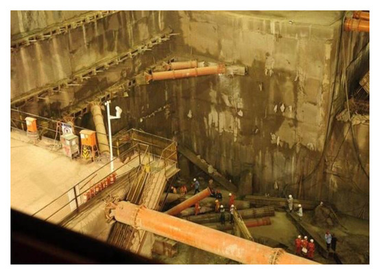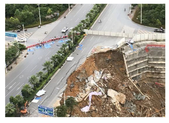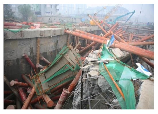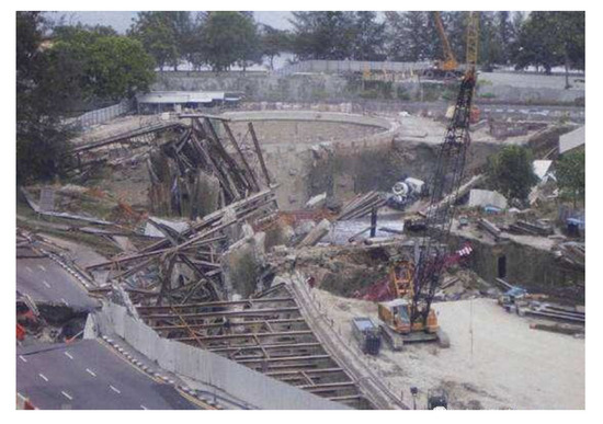 The braced excavation method is the one most commonly used because it can limit the movement induced by the excavation process and be used in excavations of any width and at any depth [3]. However, the installation of struts may result in excavation activity being obstructed. In addition, the cost of constructing and demolishing struts is pretty high [4]. Moreover, accidents may occur, such as a strike by dropping strut and the collapse of the structure, due to strut failure [2,5,6]. For example, in 2010, some steel struts dropped during the excavation of Shunyi Station (part of Beijing’s metro system, see Figure 1) which resulted in 2 deaths. The failure of struts also resulted in the collapse of Nicoll Highway in Singapore (see Figure 2) and 21 people died during the excavation of the Xianghu subway station (part of Hangzhou’s metro system, see Figure 3) because of a collapse that occurred due to the poor state of the connection between struts and wales.