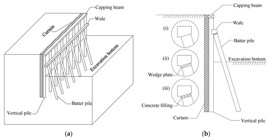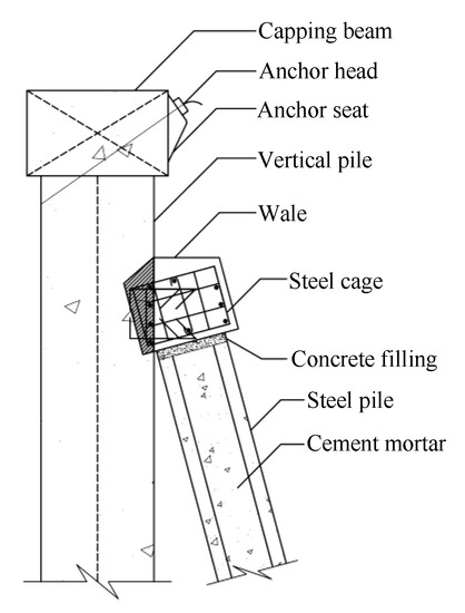 Cast-in-situ bored piles are adopted for the vertical piles and they are distributed along the edge of the excavation. A capping beam, made of reinforcement concrete, is built on top of the vertical piles to make them form a unit that increases their integrity. A wale is designed as a reinforcement concrete beam or a steel beam, and it is added to the design (below the capping beam) to link the vertical piles and batter piles together. This transfers some of the load acting on the vertical piles to the batter piles. The batter piles are made of precast (PC) piles or steel piles which are paced into soil by a pre-boring method. They tilt to the inner side of the excavation and are offset with respect to the vertical piles so that they lie in between them. Clearly, their presence will act to limit the horizontal displacement of the vertical piles together with the excavation wall. There are three types of connection between the wale and batter piles: (i) direct connection method; (ii) wedge plate method; (iii) concrete filling method. That is to say, the heads of the batter piles can be supported on the wale directly if there exists no gap between them, but the wedge plate or concrete is required for filling the gap if one exists (see Figure 6b).The lower parts of the batter piles are buried in the soil below the bottom of the excavation. The curtain is a supplementary method for cutting off drains when the groundwater level is high; it is constructed by the method of high-pressure jet grouting or cement mixing piles behind the vertical piles.