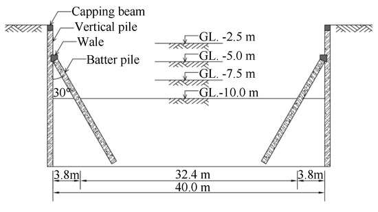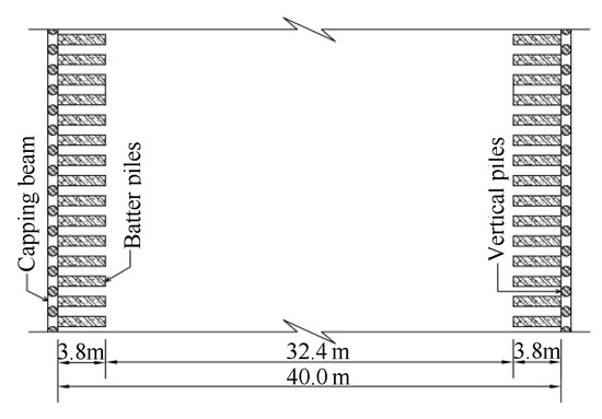 The vertical piles are taken to have diameters equal to 0.8 m and lengths equal to 20 m (the penetration depth is taken to be 10 m which is the same as the excavation depth). The center–center spacing of the vertical piles is 1.6 m, i.e., twice their diameter. The capping beam is constructed on top of the vertical piles and the wale is located 5 m below the capping beam. The batter piles are also 0.8 m in diameter and are positioned so that they lie in between each pair of adjacent vertical piles. The batter piles are inclined and the angle they make with respect to the vertical piles is assumed to be 30°. The heads of the batter piles are indirectly linked to the vertical piles by the wale. The lower parts of the batter piles are buried in the soil below the bottom of the excavation. We assume that their lengths are such that their toes lie at exactly the same horizontal level as those of the vertical piles. A plan view and profile of the HRS-supported excavation are presented in Figure 7 and Figure 8, respectively.