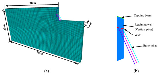 The overall dimensions of the model correspond to 90 m × 40 m × 4.8 m. The vertical piles are positioned 70 m away from the left-hand boundary, i.e., 7 times the excavation depth, to reduce boundary effects [21]. The right-hand boundary corresponds to the center of the excavation zone. The thickness of the soil extends 30 m below the bottom of the excavation, which is regarded as fairly large. The movement of the nodes along the four lateral boundaries is constrained to be in the horizontal direction perpendicular to the side of the model. The movement of the nodes along the bottom boundary is constrained in both the vertical and horizontal directions. Figure 9 illustrates the numerical mesh used to analyze the excavation process when it is supported using the HRS method.