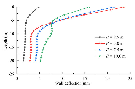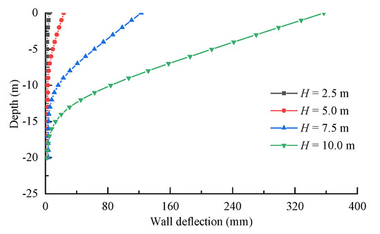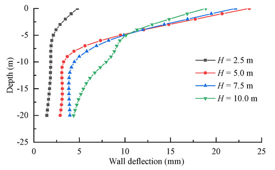 It can be seen from Figure 18 that the deformation of the wall (piles) increased significantly during the excavation process. The deflection forms a triangular distribution, with the maximum lateral wall deformation occurring at the top of the wall. The maximum movement is 26.6 mm when H = 5 m and this rapidly developed to 356.9 mm at the final excavation depth (i.e., 3.6% of H with H = 10 m). Therefore, appropriate measures would need to be taken to control the deformation induced by the excavation process.