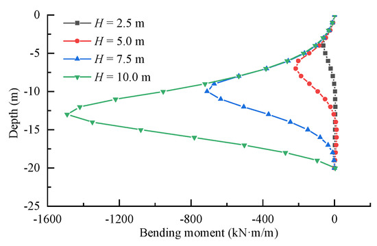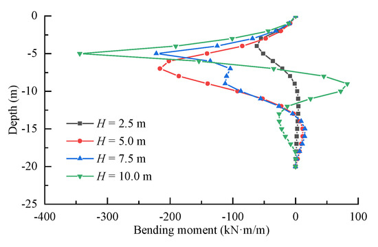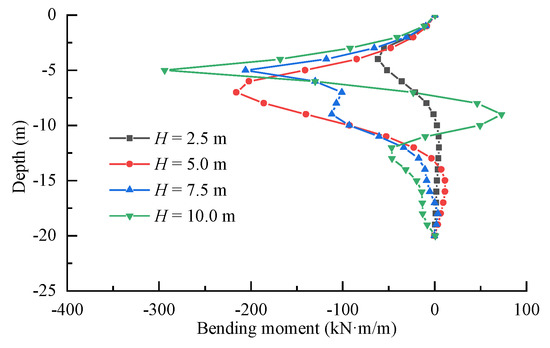 Figure 21 shows the bending moments acting on the retaining wall (piles) when HSRS is used. Comparing Figure 11, Figure 20 and Figure 21, it is clear that installing batter piles or horizontal struts when the excavation depth is 5 m can significantly reduce the bending moment acting on the retaining wall (vertical piles). Three clear extreme values also appear in Figure 21 as they did in Figure 11. The first extreme values correspond to the maximum bending moments along the wall (piles) and have the values −344 and −294 kN·m/m in Figure 11 and Figure 21, respectively (H = 10 m). These values are only 23.1% and 19.7% of the CRS value shown in Figure 22, respectively.