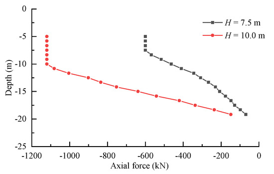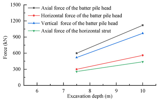 Figure 22 presents the results obtained for the axial force acting on the heads of the batter piles (HRS method) and struts (HSRS method) at different excavation depths. The results are those for the middle batter pile and strut, respectively, and a positive value corresponds to the batter pile or strut being subjected to pressure.