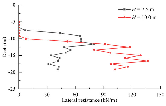 Variation of the lateral resistance along the batter piles of the HRS at different excavation depths.