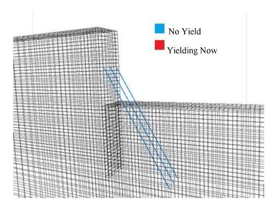Figure 14 shows the yield state of the shear coupling spring along the batter piles at the final excavation depth. It can be seen that there is no shear yield on the batter pile–soil interface, indicating that the mobilization of the lateral resistance of the batter piles is sufficient in this model.