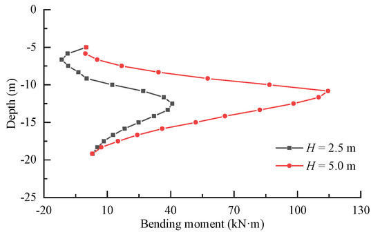 Figure 11 shows the variation of the bending moment acting on the retaining wall (piles) at the different excavation depths when it is supported using HRS. The bending moments are taken with respect to the vertical center liner of the retaining wall, a positive value corresponding to the interior cross-section of the wall being subjected to tension stress. The results depicted in Figure 11 indicate that the bending moments are negative when H ≤5 m and become larger during the excavation process. The distribution of bending moments is consistent with that obtained using a cantilever retaining structure (CRS), the maximum bending moment occurring 1.5 m below the excavation surface.