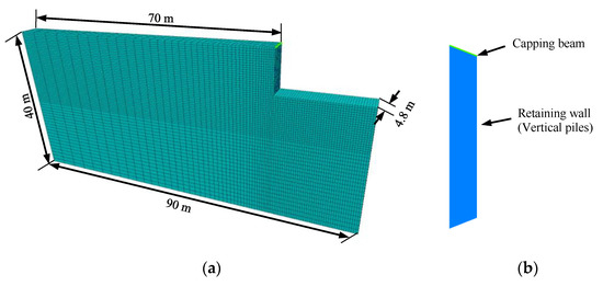 The capping beam and wale components were both simulated using beam structural elements. All the structural elements were modeled using anisotropic liner elastic models. The retaining walls (vertical piles), batter piles, and beams were all taken to have a Young’s modulus, Es, of 30 GPa. Their Poisson’s ratios, νs, were taken to be 0.2. The connections between the beams and liner elements were set to be rigid, however, the heads of the batter piles were hinged to the wale in order to prevent there being a bending moment between them. For convenience, the main properties of the structural elements used in the analysis are summarized in Table 3. The geometric parameters used for the supporting structure are consistent with those of the prototype given in Section 3.1.1.