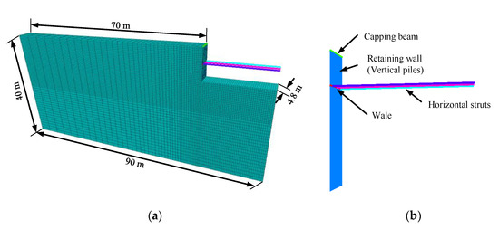 Three-dimensional (3D) numerical models of an excavation supported using a horizontal-strutted retaining structure (HSRS): (a) difference element mesh of the excavation supported using HSRS; (b) expanded view of the difference element mesh.