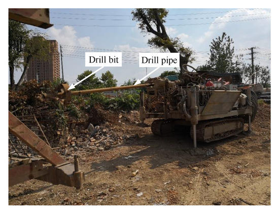 A retaining system based on the new HRS method was designed to protect the excavation based on the environmental and geological conditions of the site described above (see Figure 23 and Figure 24). The design involved first excavating the soil to a depth of 3.25 m with slope of 40°. Then, the next 6 m of the excavation process (from −3.25 to −9.25 m) was to be protected using the HRS approach. The main supports were to be based on bored cast-in-situ vertical piles (Φ800 mm) and steel pipe batter piles (Φ500 mm). The vertical piles were to have a center-center spacing of 1.5 m. The batter piles were placed into soil by pre-boring with an inclination of 17°. The pre-boring holes for steel pipe batter piles were drilled by an improved machine, which is modified from the machine used to drill holes for anchors (see Figure 25). The drill bit diameter of the machine is 500 mm, and it can drill a hole in ground with an inclination of 0–45° from a vertical axis. It is the first application of the new machine in this case. The steel pipe piles were filled with cement mortar after they were placed into the ground, in order to increase batter pile stiffness. The gap between the wale and the batter pile head was filled with concrete. An anchor cable inclined at 35° from a horizontal axis was also incorporated into the design (at the top of the bored piles) to further strengthen the retaining system. High-pressure rotary sprayed piles measuring Φ800@500 mm were also constructed to act as a waterproof curtain behind the cast-in-situ piles.
